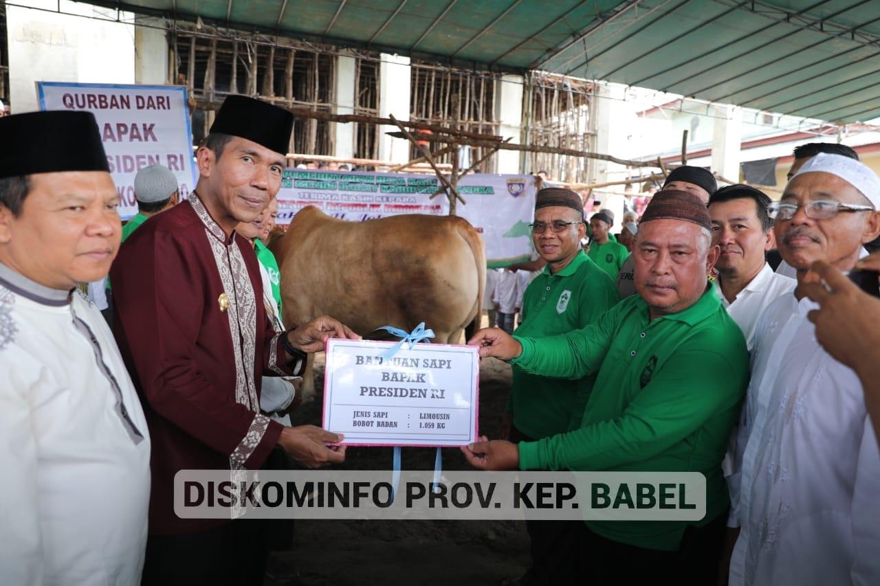 Suganda Pasaribu mewakili pemprov babel menyerahkan sapi qurban bantuan Presiden Jokowi kepada Warga Desa Kace Kecamatan Mendo Barat ( Foto : humas pemprov babel)