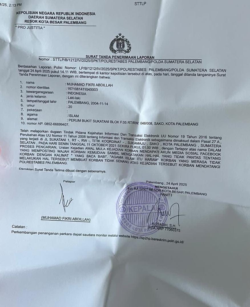 Palembang, Deteksi Pos– Muhammad Fikri Abdillah melaporkan dugaan pencemaran nama baik ke Polrestabes Palembang.